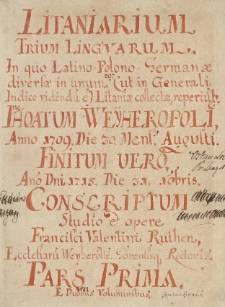 633 k. , 18,5x24 cm ; Autor rkps F. W. Ruthen, Polak, był rektorem kościoła m. in. w Wejherowie, potem proboszczem w Kłodawie koło Gdańska. Poza odpisami litanii, pieśni i psalmów, przepisał również w 1708 Campus Appolinis [...] 1692 zbiór poezji ; Pismo rkpsu staranne, tytuły i inicjały czerwonym atramentem. Przy poszczególnych litaniach i pieśniach data ich przepisania, a bardzo często również źródło, z którego zostały zaczerpnięte. Dalszy ciąg podobnych materiałów zawarty jest w rkpsach: BK 39, 40, 41, 42.