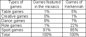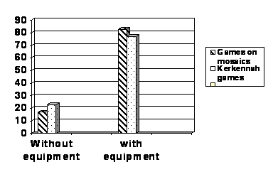 It should be noted that games requiring equipment in both cultures outnumber games played without equipment. 82% of the games featured in the mosaics were performed with objects specifically designed for that purpose. In the Isles of Kerkennah 77% of the games require various kinds of equipment. Games accessories are natural and household in situ objects of general use. The objects are usually imperfect in their manufacturing and are revealing of the social context where they were developed.