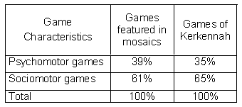 According to the results of our investigation, we noted that both cultures put an emphasis on sports games: Romans 91%, present-day Kerkennians 65%. Among the sports games of both civilizations, it should be pointed out that sociomotor games clearly outnumbered psychomotor games which involved motor communications between participants. Both cultures are similar in emphasizing contact and exchange with others.