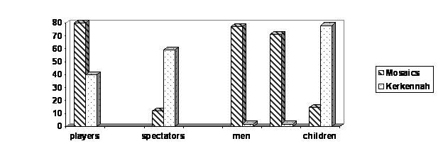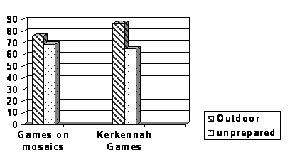 We can notice that the games in both cultures are mostly outdoor games (87% of games in the mosaics, 76% of present-day Kerkennah). Therefore, these play activities are closely linked to the natural and domestic environment. More than two thirds of play practices of both cultures take place on unmarked grounds (69% of games in the mosaics, and 65% of present-day Kerkennah games).