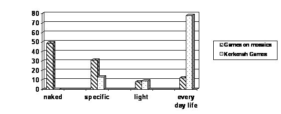 According to the findings of our investigation, the players participated naked in 49% of the games featured in the mosaics. It appears that nakedness was adopted for aesthetic reasons and as a means of protection against evil. On the other hand, in 78% of leisure games played by the population of Kerkennah, the participants wore their everyday clothes. It should also be noted that Islam imposes some restrictions on exhibition of some body parts, as well as clothing constraints for both men and women.