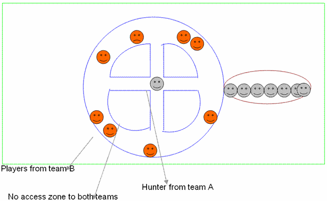 Evaluation:After 10 minutes from the start of the game, the number of players who remain inside the circle is counted. The team which succeeds in maintaining the highest number of participants inside the circle wins. Two points are granted to the winning team and naught to the opposing team. In the case of tie each team is granted one point.