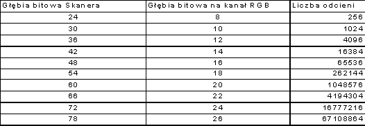 W rzeczywistości na rynku możemy spotkać skanery z 30 lub nawet 36 bitową głębia próbkowania. Przy 30 bitach skaner może odróżnić 1 miliard odcieni szarości, a w przypadku 36 bitów - nawet 68 miliardów. Widać to najlepiej w poniższej tabeli: