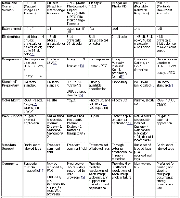 Podsumowując istnieje wiele formatów reprezentacji obrazów cyfrowych. Każdy format posiada określone cechy które tak naprawdę określają jego konkretne zastosowanie. Na potrzeby digitalizacji preferuje się korzystanie z następujących formatów: Poniższy wykaz został zaczerpnięty z Digital Imaging Tutorial znajdującego się w Internecie pod adresem http://www.library.cornell.edu/preservation/tutorial/contents.html