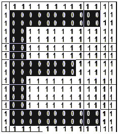 Na Rys. 2.1 przedstawiono przykładowy dwukolorowy obraz. Każdemu punktowi obrazu (pikselowi) odpowiada określona wartość tonalna - w przedstawionym przykładzie wartość "0" odpowiada kolorowi czarnemu, a wartość "1" białemu.