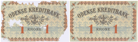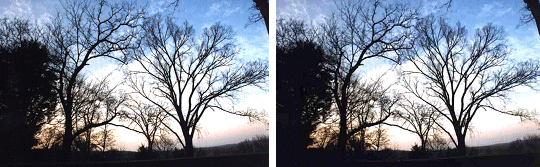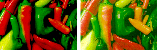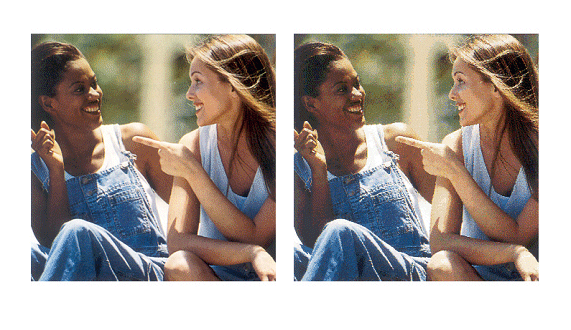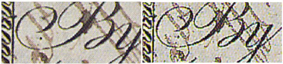 Obraz lewy został skanowany z rozdzielczością optyczną. Obraz prawy - tylko 25% pikseli zostało fizycznie ze skanowanych, więc skaner czterokrotnie powiększył obraz przez interpolację. [10] Przyglądając się uważnie obydwu obrazom można zauważyć, że prawy interpolowany obraz jest bardziej postrzępiony, ma ciemną tonację i nie odzwierciedla tylu szczegółów co lewy obraz. Reasumując należy pamiętać, że chcąc uzyskać dobrej jakości obraz cyfrowy należy korzystać tylko z rozdzielczości optycznej