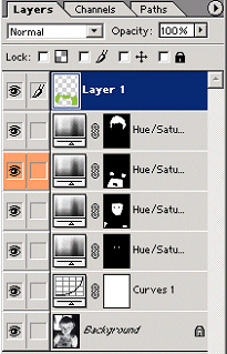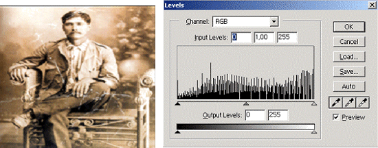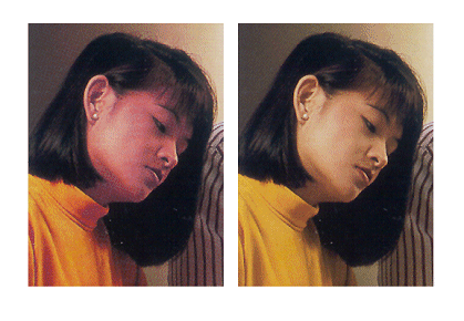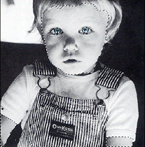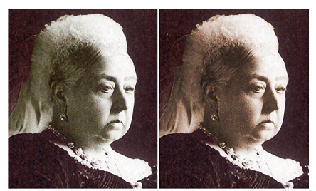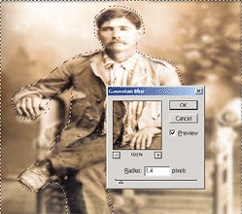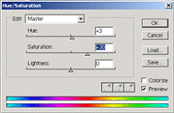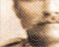 Po zeskanowaniu, powiększam widok i zaznaczam zniekształcone fragmenty fotografii za pomocą Lasso lub Eliptical Marquee. Następnie koryguję luminancję i barwę wykorzystując wcześniej omówione narzędzieHue/Saturation |