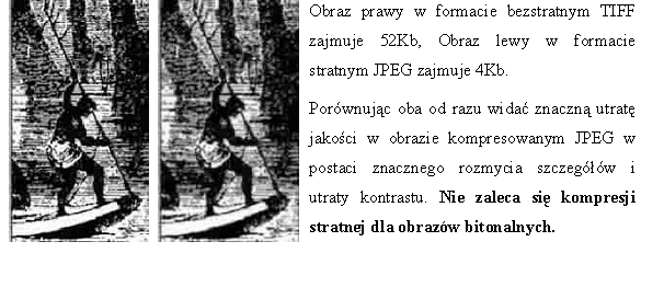 Po lewej mamy obraz otrzymany w wyniku kompresji bezstratnej w formacie TIFF, plik zajmuje 756Kb. Po lewej obraz w kompresji stratnej JPEG, plik zajmuje 32Kb.