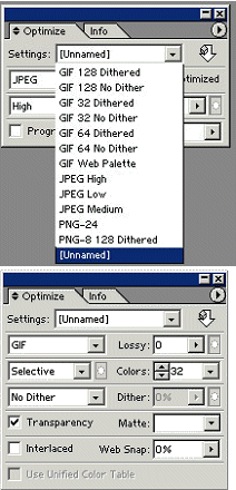 Jak już wyżej wspomniałem w tej aplikacji. mamy do wyboru kilka wariantów optymalizacji: Gif'a, JPEG'a i PNG Z palety optymalizacji z pola Settings należy więc wybrać interesujący nas format zapisu. Następnie w tej samej palecie trzeba określić parametry kompresji w zależności od formatu. Można na przykład określić jakość kompresji między low a high za pomocą suwaka (Quality), progresywność, stratność, ustawienia dotyczące kolorów, stopień rozmycia oraz opcje mechanizmu korekcji błędów (Dither) i przezroczystości dla GIF'a. Użytkownik może następnie zapisać swoje preferencje optymalizacyjne i wyświetlać je także na liście settings tejże palety wciskając przycisk czarny trójkąt z kółeczkiem i z wywołanej listy menu podręcznego zastosować Save Settings. |