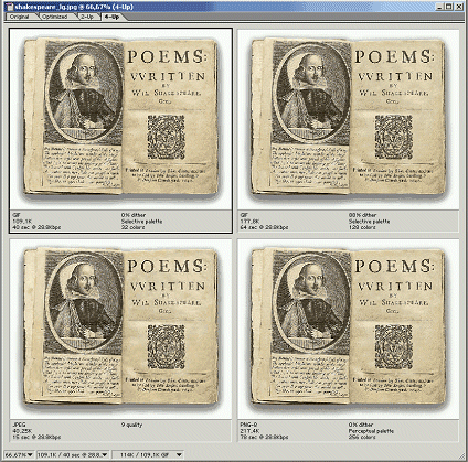 Duża siła optymalizacji w aplikacji Adobe usytuowana jest w podglądzie efektów ustawień optymalizacyjnych. W górnej krawędzi okna edytowanego obrazu ustawione są cztery zakładki. Domyślnie wyświetlana jest pierwsza czyli oryginał (zakładka Original), druga (Optimized) ukazuje zmodyfikowany obraz po optymalizacji, trzecia (2-Up ) wyświetla zarówno oryginał jak i obraz zoptymalizowany ostatnia czwarta (4-Up) zawiera oryginalny obraz oraz trzy wersje zoptymalizowane. Korzystając z tej karty można bardzo szybko ustalić który format jest odpowiedni dla danego obrazu. Dodatkowo na dole każdego okna obrazu znajdują się parametry reprezentujące jego jakość, wielkość pliku oraz czas pobierania przy określonej prędkości modemu. Klikając strzałki skierowane w dół można wyświetlać dodatkowe informacje. W ten sposób określa się szybkość modemu , skale wyświetlania, dokładne informacje o pliku jak: jego rozmiar, rozdzielczość, znak wodny, stopień kompresji itd. Całą procedurę widać wyraźnie na rysunku poniżej: