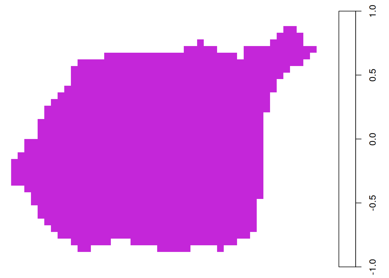 Nieregularną siatkę klasy RasterLayer łatwo jest przetworzyć do klasy SpatialPixelsDataFrame.
