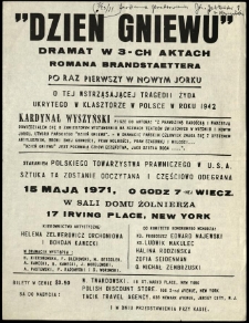 Materiały dostęone wyłącznie w czytelniach PAN BK w Kórniku i Poznaniu ; k. 43 fot. 3 34x24 cm i mn. ; luźne ; Odczytanie i częściowe odegranie sztuki w Domu Żołnierza Polskiego w Nowym Jorku, staraniem Polskiego Towarzystwa Prawniczego w USA, przez zespół artystyczny pod kierunkiem Heleny Zelwerowicz-Orchoniowej i Bohdana Kaweckiego 1971. Ogłoszenie i wycinki prasowe (4) k. 1-5 ; Przedstawienie w przekładzie niemieckim Gerdy Hagenau wystawione przez zespół amatorski "Der Spiegel" w Wiedniu, w reżyserii Fritza Grubauera ok. 1965. Program, dokumentacja fotograficzna (3 fot.), odpis i tłumaczenie recenzji k. 6-11 ; Przedstawienie telewizyjne przygotowane przez Bayerischer Rundfunk w Monachium, w reżyserii Kurta Meisela, prezentowane na Międzynarodowym Festiwalu Telewizyjnym w Pradze 1966. Druki informacyjne, przedruki recenzji i wycinki prasowe (5) k. 12-43 ; Brandstaetter Roman, "Dzień gniewu" dokumentacja fotograficzna Tanzenberg m. Austria teatr 7x10 cm k. 7-9 fot. cz.-b.